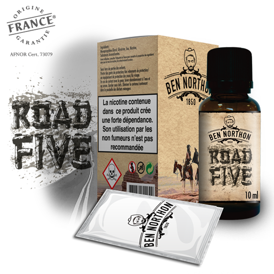 Road Five je založená na suchej blond tabakovej aróme, všetko, čo si človek predstaví o chuti amerického typu medzi pieskom, zemou a vetrom. V dokonalej aromatickej rovnováhe je jeho vrchná nota medená a silná, jeho okrúhlosť, chuť tabaku s charakterom, a jeho živé dĺžky. Rovnako príjemné ako originál.